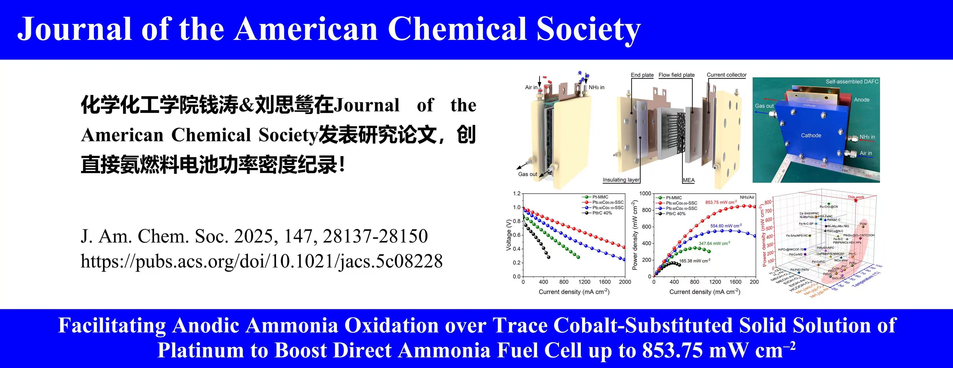化学化工学院钱涛、刘思鸶团队在《Journal of the American Chemical Society》上发表研究论文: Facilitating Anodic Ammonia Oxidation over Trace Cobalt-Substituted Solid Solution of Platinum to Boost Direct Ammonia Fuel Cell up to 853.75 mW cm–2(微量钴置换铂固溶体促进氨氧化反应助力直接氨燃料电池功率突破853.75 mW cm-2)