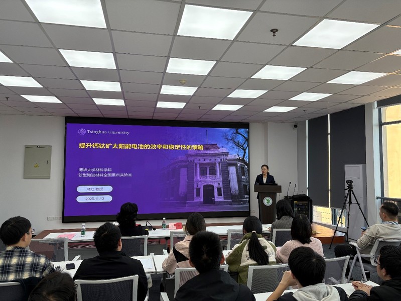报告中,林红教授结合自身长期科研积累,围绕材料的结构设计与制备、表面与界面化学等核心方向,系统阐述了钙钛矿太阳能电池、叠层太阳能电池等新能源器件的研发进展。针对钙钛矿太阳能电池效率提升与稳定性优化的关键技术瓶颈,她分享了团队在材料改性、器件结构创新等方面的突破性成果与实践经验,为在场师生提供了兼具理论深度与应用价值的学术参考。互动环节中,师生们结合学院科研特色与自身研究方向踊跃提问,林红教授耐心解答各类专业困惑,就新能源材料领域的前沿动态、产学研合作路径等展开热烈探讨,现场学术氛围浓厚。