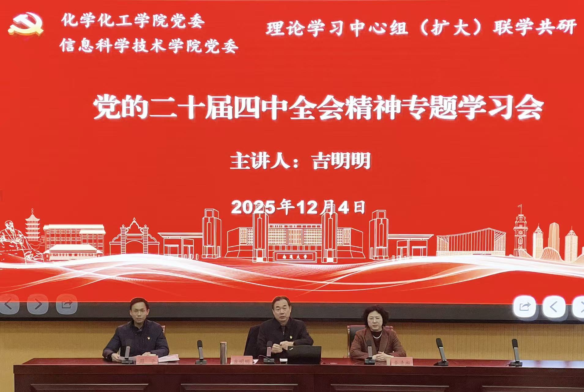 12月4日,化学化工学院党委、信息科学技术学院党委理论学习中心组(扩大)开展了专题学习贯彻党的二十届四中全会精神的联学共研活动,活动邀请市委宣讲团成员、校党委常委、副校长吉明明做专题报告。
