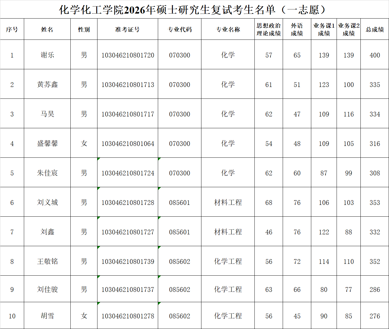 化学化工学院2026年硕士研究生复试考生名单(一志愿)