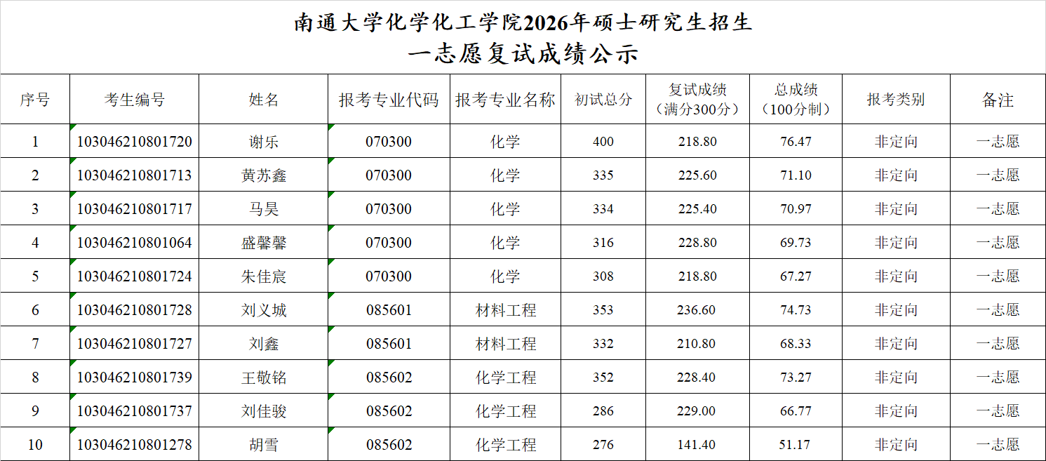 南通大学化学化工学院2026年硕士研究生招生一志愿复试成绩公示