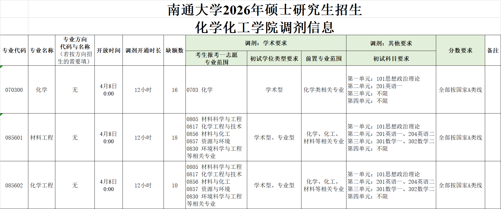南通大学2026年硕士研究生招生化学化工学院调剂信息发布