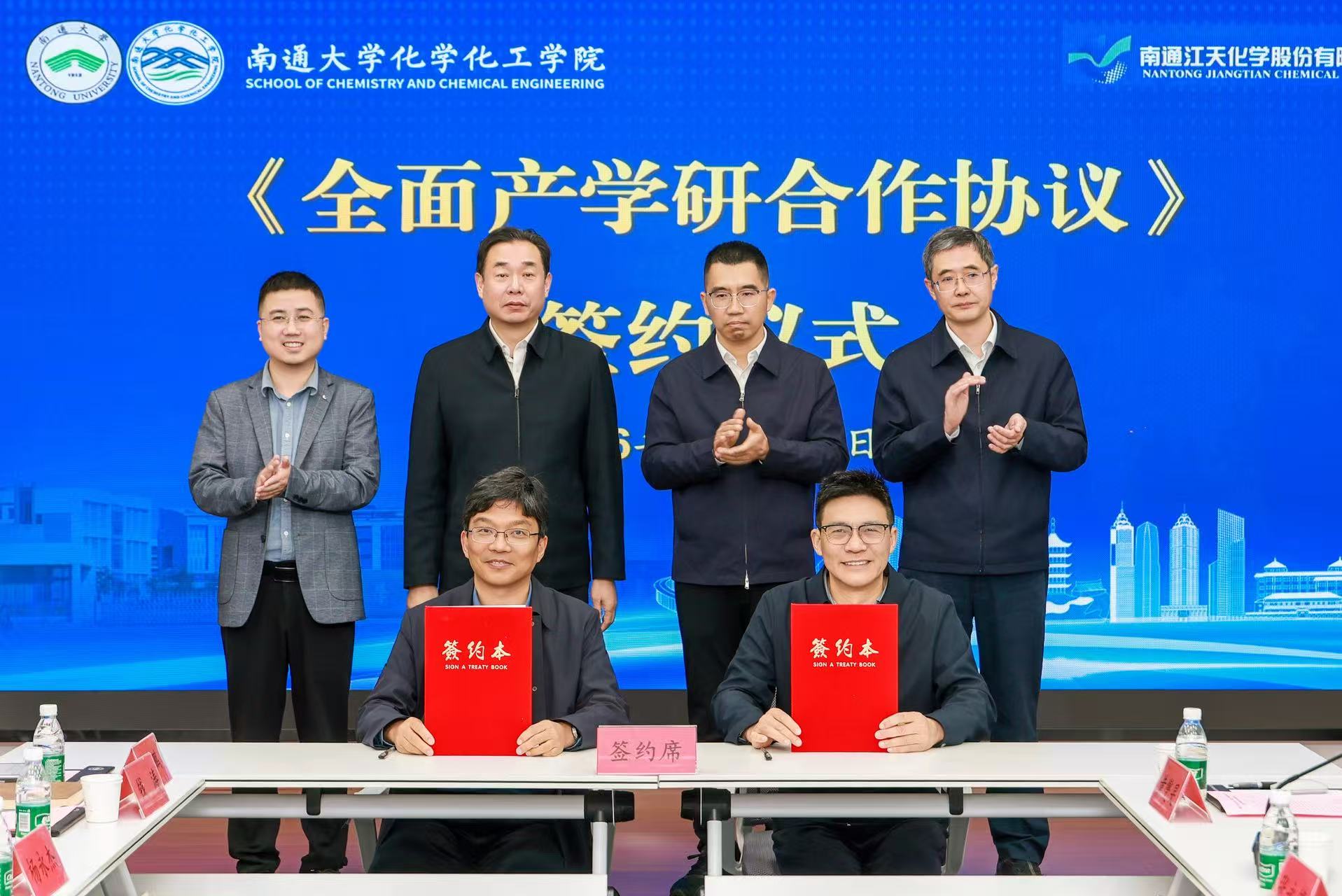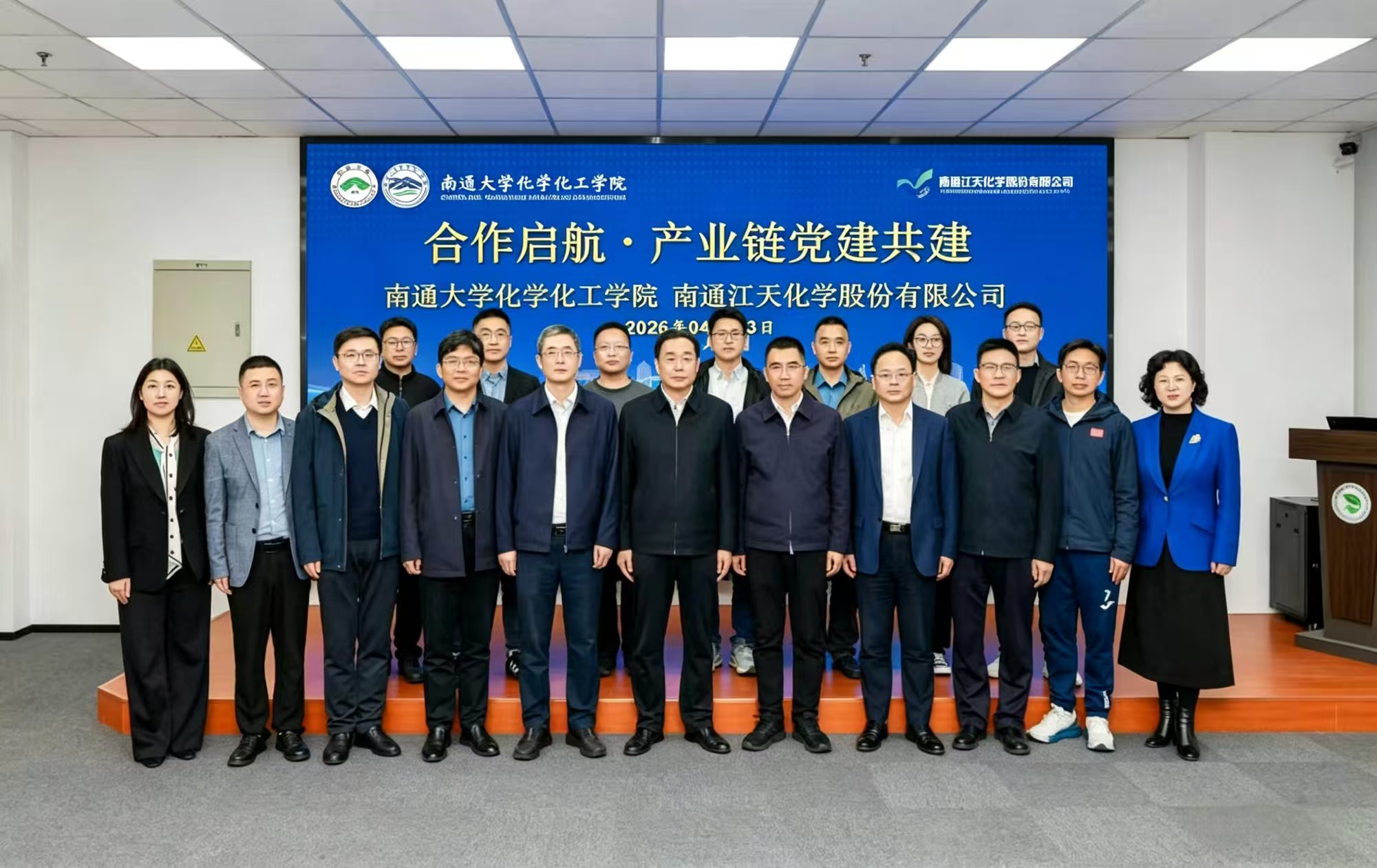 为深入贯彻落实学校高质量发展要求,加速产学研用深度融合,4月14日下午,化学化工学院与南通江天化学股份有限公司校企合作推进会暨产业链党建共建签约仪式于纺化楼C719会议室举办。校党委常委、副校长吉明明,校党委常委、组织部部长吴如高,南通产控集团有限公司总经理成刚,江天化学股份有限公司董事长兼总经理朱辉出席活动。